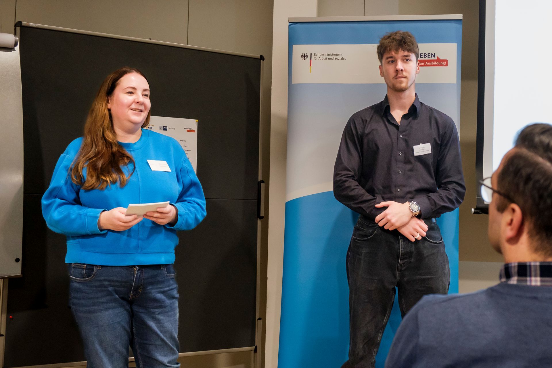 "Ausbildung ist wie eine Leiter", sagte Özlem Kutlu von der Türkischen Gemeinde Hamburg auf der Konferenz anlässlich der Zwischenbilanz des ESF Programms "Rat geben - Ja zur Ausbildung"! Rund 70 Teilnehmende waren am 6. November 2024 zu der Fachveranstaltung nach Berlin gekommen, um eine Zwischenbilanz zum Programm zu ziehen. Sie diskutierten über weiterführende Möglichkeiten und Wege, mit der Unterstützung von Bezugspersonen wie Eltern und Sporttrainerinnen und -trainern, den Übergang von der Schule in eine Berufsausbildung bei jungen Menschen mit Flucht- und Migrationshintergrund (Mgh und Fhg) zu fördern. Auch die Herausforderungen bei der Ansprache von Bezugspersonen wurden thematisiert. Auf Einladung des Bundesministeriums für Arbeit und Soziales waren auch die Leiterin der KAUSA-Landesstelle Hamburg (KS LS HH), Arzu Pehlivan, und Evelyn Jabben, Projektleiterin von "Mobil für Ausbildung" (MofA) aus der Hansestadt in die Hauptstadt gereist.